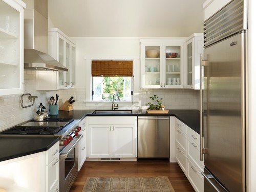 The experts consider this the most efficient floor plan. It uses three adjoining walls in a logical sequence of activity between storage areas, sink and stove.
